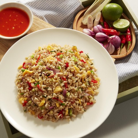 Nasi goreng ala GM disajikan dengan sambal matah, porsi small.